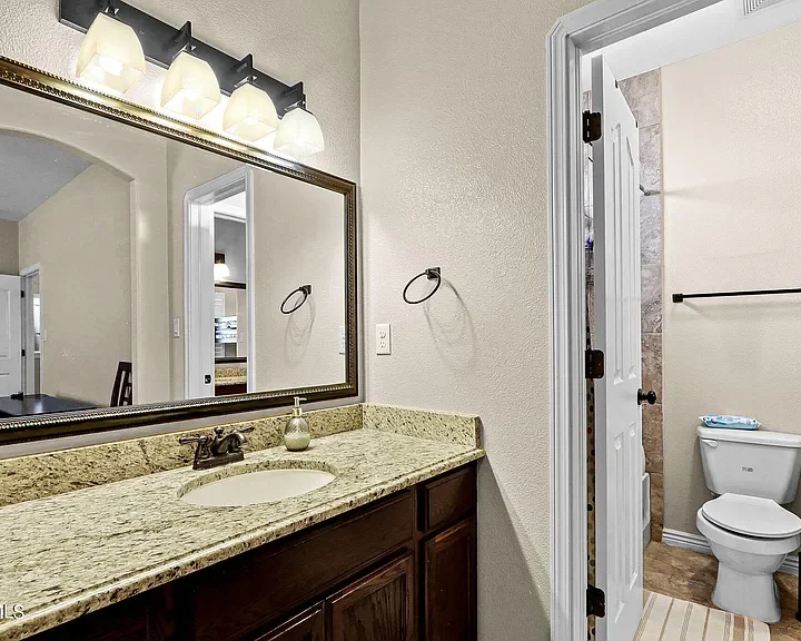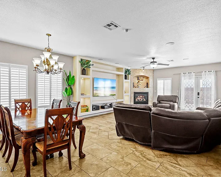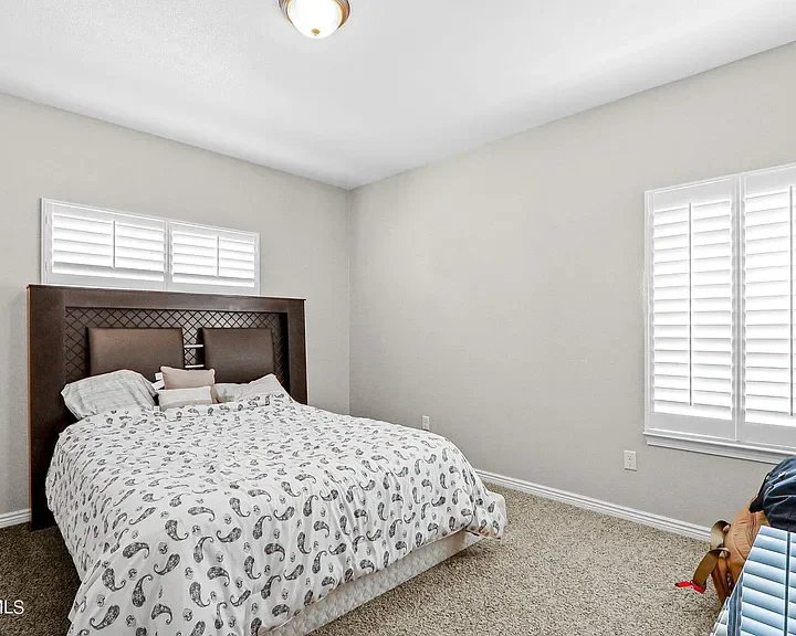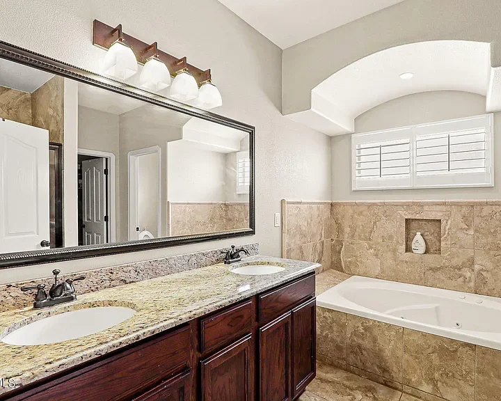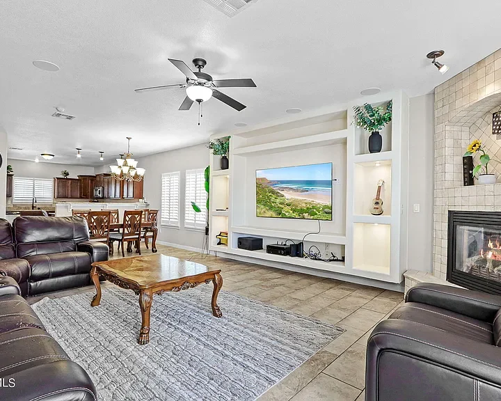 Exceptional 5-Bedroom Home on a Corner Lot with Dual Master Suites! Discover your dream home in this spacious 5-bedroom, 3.5-bathroom residence, perfectly situated on a desirable corner lot. This stunning home features two master suites, one conveniently located on the main level and another upstairs. Entertain with ease in the open-concept living area that includes a cozy fireplace, granite countertops, and stainless steel appliances in the kitchen. A large loft area provides extra space for a game room, home office, or media room. The exterior offers an entertainer’s paradise backyard featuring a built-in grill, stone benches, stamped concrete, and lush rock wall surrounds. Enjoy energy efficiency with solar panels and refrigerated air to keep cool during the warmer months. Additional highlights include a 3-car garage, laundry room, and elegant shutters on windows throughout the home.